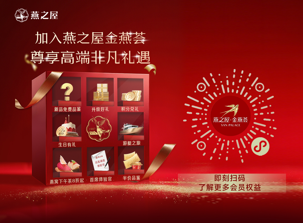 即刻掃碼,加入燕之屋金燕薈,開(kāi)啟高端品質(zhì)生活,為您定制更多專寵禮遇,享受專屬的尊貴體驗(yàn)。