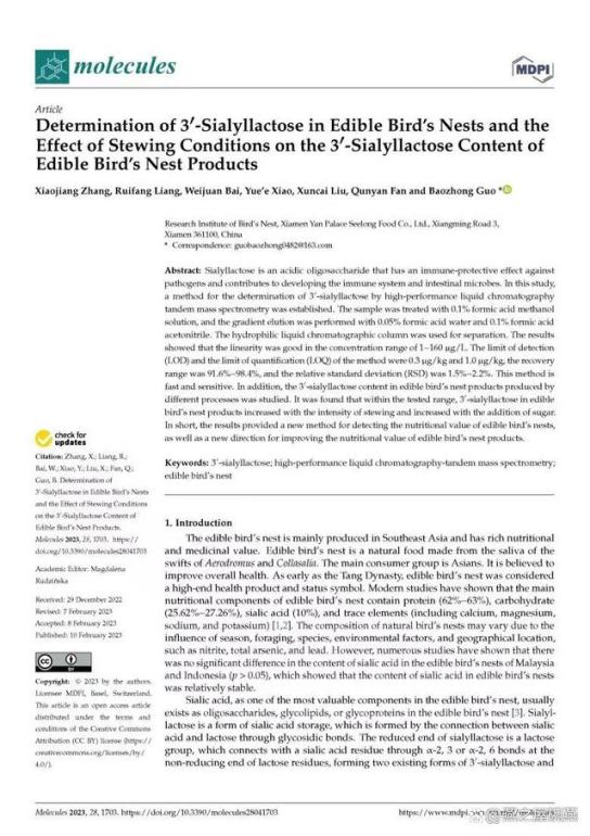 科技創(chuàng)新是產(chǎn)業(yè)發(fā)展的重要源泉和動力。多年來,燕之屋堅持傳承中國滋補文化的同時,結合現(xiàn)代科研技術深入研究,充分挖掘燕窩的營養(yǎng)價值及功效。現(xiàn)代研究發(fā)現(xiàn),“燕窩富含蛋白質、氨基酸、唾液酸和無機元素等,具有抗氧化、改善免疫、抑制血凝、調節(jié)腸道菌群等功效(來自:白偉娟等.《燕窩成分及功效研究進展》,2020)。”在燕之屋燕窩研究院科研團隊新近發(fā)布的研究成果中,基于開創(chuàng)性地建立的燕窩中3'-唾液酸乳糖的LC-MS/MS測定方法,及兩年的跟蹤研究發(fā)現(xiàn)3'-唾液酸乳糖作為一種更容易吸收的唾液酸形態(tài),適當?shù)臒踔笥兄谘喔C中的唾液酸向更易吸收的3'-唾液酸乳糖的形態(tài)轉化。研究表明,“碗燕產(chǎn)品中3'-唾液酸乳糖含量顯著高于家庭燉煮燕窩(100℃ 30min)(來自:國際權威期刊《Molecules》,Determination of 3'-Sialyllactose in Edible Bird's Nests and the Effect of Stewing Conditions on the 3'-Sialyllactose Content of Edible Bird's Nest Products)。”如燕之屋旗下高端燕窩品牌碗燕飛天款的3'-唾液酸乳糖含量相對于于燉煮燕窩高達20余倍,表明燕之屋專利燉煮工藝(專利號:ZL201410393800.4 ;專利名稱:一種速食燕窩軟罐頭的制作方法)能夠激發(fā)燕窩的營養(yǎng)活性,提升燕窩產(chǎn)品的營養(yǎng)價值(來自:燕之屋燕窩研究院,碗燕產(chǎn)品五維營養(yǎng)分析報告)。”此外,燕之屋燕窩研究院科研團隊一直以來燕之屋始終堅持走“研發(fā)立企、創(chuàng)新興企”之路,基于研究成果不斷對產(chǎn)品進行升級和創(chuàng)新,致力于為消費者打造更為科學、營養(yǎng)、健康的產(chǎn)品。截止至2023年8月1日,燕之屋發(fā)表論文共計44篇,其中SCI 11篇。