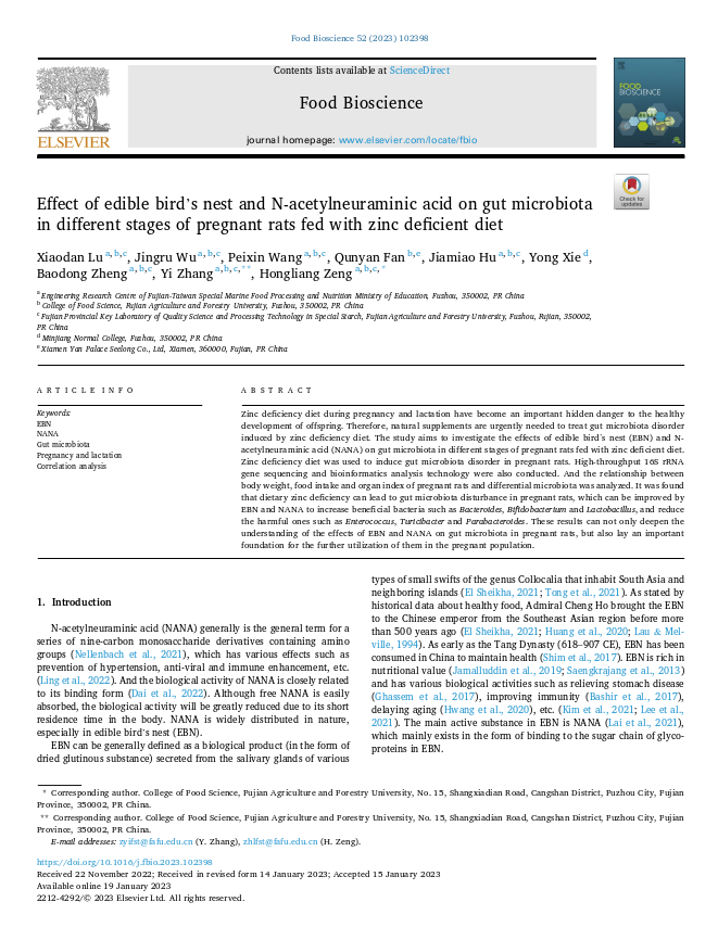 近年來,人們愈發(fā)關(guān)注腸道健康,越來越多的證據(jù)顯示,腸道菌群能夠通過產(chǎn)生菌群代謝產(chǎn)物、影響機體免疫反應(yīng)、調(diào)節(jié)迷走神經(jīng)及干預(yù)腸內(nèi)分泌系統(tǒng)等多種途徑和神經(jīng)系統(tǒng)相互作用?;诖?,燕之屋聯(lián)合各大高校持續(xù)對食用燕窩的有益作用展開深入研究。今年1月,燕之屋關(guān)于“Effect of edible bird’s nest and N-acetylneuraminic acid on gut microbiota in different stages of pregnant rats fed with zinc deficient diet(食用燕窩和N-乙酰神經(jīng)氨酸對低鋅飲食孕鼠不同時期腸道菌群的影響)”的研究成果被食品科學(xué)領(lǐng)域國際知名SCI期刊《Food Bioscience》收錄。