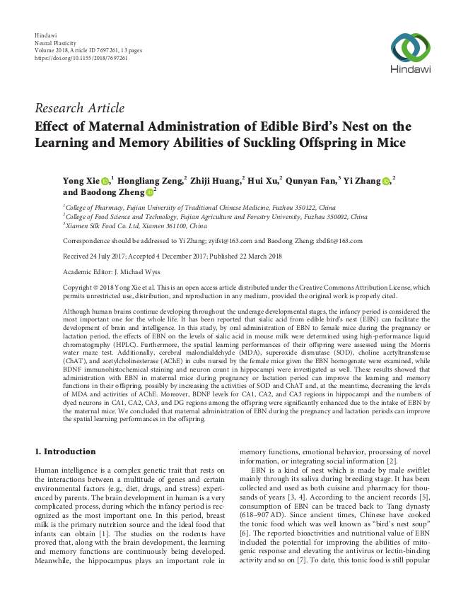 早在2018年3月,燕之屋關(guān)于“Effect of Maternal Administration of Edible Bird’s Nest on the Learning and Memory Abilities of Suckling Offspring in Mice(母鼠食用燕窩對子代學(xué)習(xí)記憶能力的影響)”的研究成果就登上了食品科學(xué)領(lǐng)域國際知名SCI期刊《Neural Plasticity》。研究結(jié)果表明,食用燕窩提升了子代腦內(nèi)海馬體中CA1,CA2和CA3區(qū)域的BDNF(一種神經(jīng)營養(yǎng)因子)水平及CA1,CA2,CA3和DG區(qū)域的染色神經(jīng)元數(shù)量,這標(biāo)志著子代學(xué)習(xí)記憶能力的提升。該項研究推測食用燕窩通過增強超氧化物歧化酶和膽堿乙酰轉(zhuǎn)移酶的活性,同時降低腦內(nèi)丙二醛的水平和乙酰膽堿酯酶活性,來緩解氧化應(yīng)激損傷、改善子代的學(xué)習(xí)記憶能力,是業(yè)界首次揭示母體食用燕窩對改善子代學(xué)習(xí)記憶能力的作用及機制的研究。