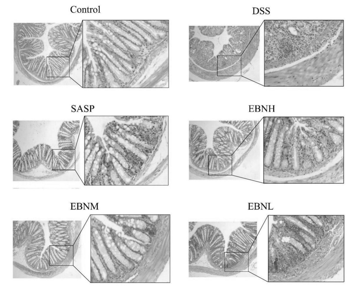 通過觀察結(jié)腸組織病理學(xué)變化發(fā)現(xiàn),正常結(jié)腸組織結(jié)構(gòu)完整,隱窩、腺體排列整齊,未見炎性細(xì)胞浸潤。與之相比,患病結(jié)腸出現(xiàn)大量炎性細(xì)胞浸潤,腸上皮大面積脫落、腺體排列雜亂甚至消失、杯狀細(xì)胞減少、黏膜下層水腫等現(xiàn)象。食用燕窩的結(jié)果顯示(專利名稱:燕窩在制備治療潰瘍性結(jié)腸炎藥物中的應(yīng)用,專利號: ZL 2021 1 0362817.3),“提前給予燕窩一段時(shí)間,能增強(qiáng)機(jī)體對外界刺激因子的抵抗力,減緩因DSS誘導(dǎo)造成小鼠體重下降,改善結(jié)腸炎癥,降低促炎因子水平,有效減輕潰瘍性結(jié)腸的癥狀及炎癥指標(biāo)。”
