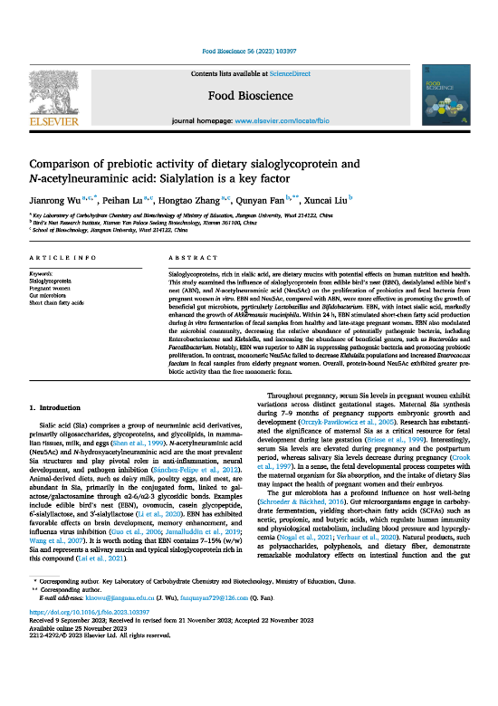 圖:燕之屋燕窩研究院研究論文獲國際權(quán)威期刊《Food Bioscience》收錄
