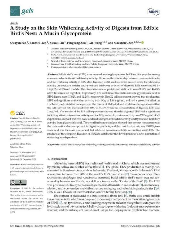燕之屋潛心燕窩肽研究,成立燕之屋燕窩肽研究中心,聚焦燕窩肽酶解技術(shù)、活性成分與功能研究等多方向賽道,近年來不斷取得突破,成果斐然。2021年,燕之屋燕窩研究院和江南大學(xué)食品科學(xué)與技術(shù)國家重點(diǎn)實(shí)驗(yàn)室聯(lián)合完成研究成果“A study on the skin whitening activity of digesta from edible bird's nest: A mucin glycoprotein”,發(fā)布于權(quán)威學(xué)術(shù)性期刊《Gels》;2022年,燕之屋燕窩研究院攜手香港科技大學(xué)攜手完成燕窩肽抗皮膚炎癥功能研究,專業(yè)研究成果“Edible bird’s nest, an Asian health food supplement, possesses anti-inflammatory responses in restoring the symptoms of atopic dermatitis: An analysis of signaling cascades”發(fā)布于權(quán)威學(xué)術(shù)性期刊《Frontiers in Pharmacology》;2023年,燕之屋燕窩研究院通過體外生化、細(xì)胞、生物三維立體證實(shí)了燕窩肽的抗衰老功效,并在國際權(quán)威期刊《Journal of Functional Foods》發(fā)表了燕窩肽抗衰研究"Study of the antiaging effects of bird's nest peptide based on biochemical, cellular, and animal models",揭示燕窩肽抗衰老功效,再一次為燕窩肽的研究發(fā)展貢獻(xiàn)有利價(jià)值。近日,燕之屋“一種具有促進(jìn)細(xì)胞修護(hù)、高保濕美白功效的燕窩肽制備方法及應(yīng)用”獲得國家知識(shí)產(chǎn)權(quán)局發(fā)明專利授權(quán)(專利號(hào):ZL 2022 1 1398048.3),充分證明燕之屋在燕窩肽領(lǐng)域的引領(lǐng)地位。
