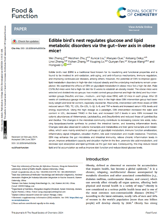 近日,燕之屋在食品科學領(lǐng)域取得了重大突破,開展的一項題為“Edible bird’s nest regulates glucose and lipid metabolic disorders via the gut–liver axis in obese mice”的研究成果證實燕窩(鮮燉燕窩)能夠通過腸-肝軸調(diào)節(jié)糖脂代謝紊亂,在解決與葡萄糖、脂質(zhì)和脂肪相關(guān)的代謝失衡方面起著關(guān)鍵作用;該研究成果被食品科學領(lǐng)域國際知名SCI收錄期刊《Food & Function》正式收錄和發(fā)表,不僅具備科學性、創(chuàng)新性和可行性,而且具有推動燕窩行業(yè)的科學研究和產(chǎn)品創(chuàng)新的巨大潛力。