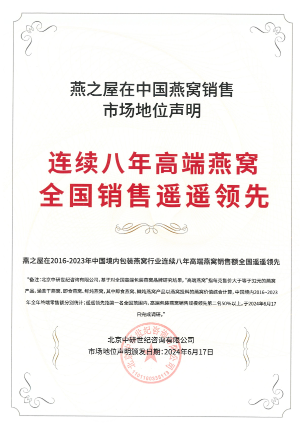 圖:燕之屋連續(xù)八年高端燕窩全國(guó)銷售第一、燕之屋連續(xù)八年高端燕窩全國(guó)銷售遙遙領(lǐng)先