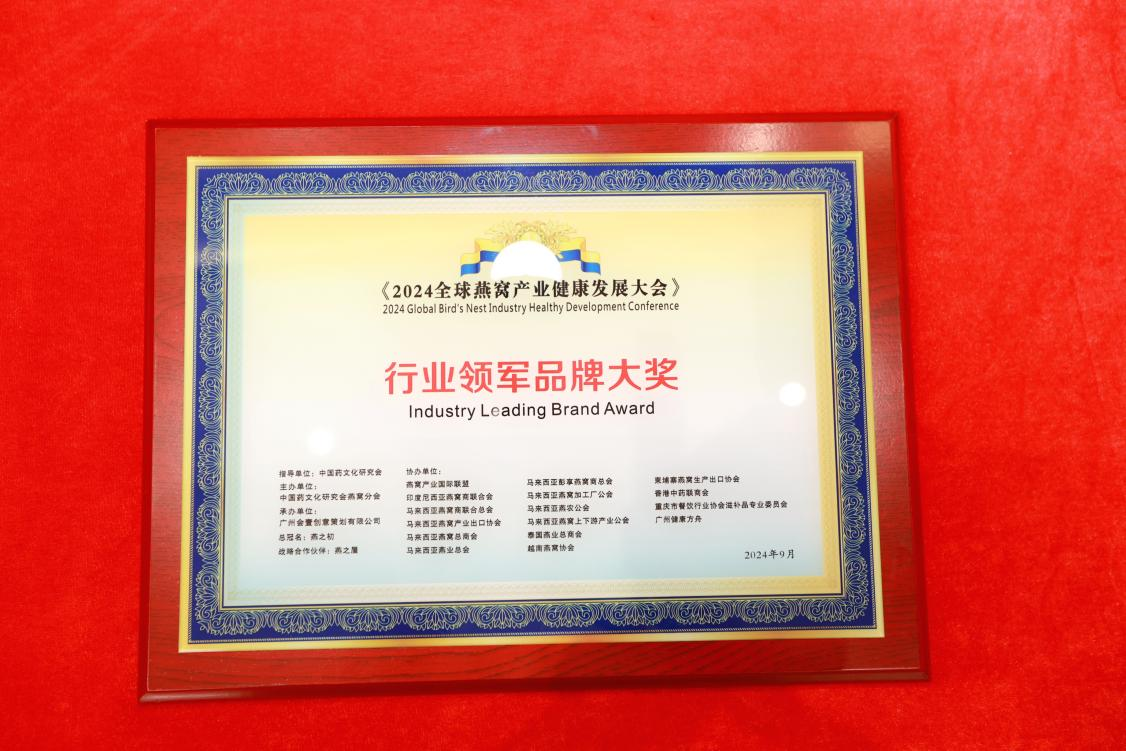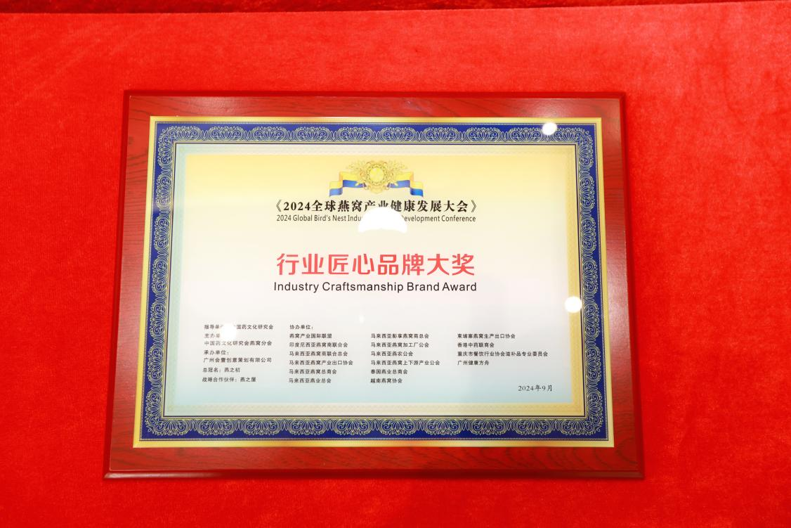 9月23日,在榜樣的力量一行業(yè)表彰盛典上,燕之屋憑借先進的創(chuàng)新引領(lǐng)力、卓越的產(chǎn)品競爭力、強勁的品牌影響力榮獲行業(yè)領(lǐng)軍品牌大獎、行業(yè)匠心品牌大獎、技術(shù)創(chuàng)新大獎,燕之屋創(chuàng)始人、執(zhí)行董事兼董事長黃健榮獲行業(yè)領(lǐng)軍人物;燕之屋傾情助力2024全球燕窩產(chǎn)業(yè)健康發(fā)展大會,進一步推動燕窩產(chǎn)業(yè)的創(chuàng)新發(fā)展,促進燕窩文化的傳承與交流,為行業(yè)的繁榮貢獻力量,獲頒《2024全球燕窩產(chǎn)業(yè)健康發(fā)展大會》戰(zhàn)略合作單位,并成為《2024全球燕窩產(chǎn)業(yè)健康發(fā)展大會》唯一指定碗燕即食燕窩品牌,燕之屋公關(guān)總監(jiān)楊航上臺領(lǐng)獎。