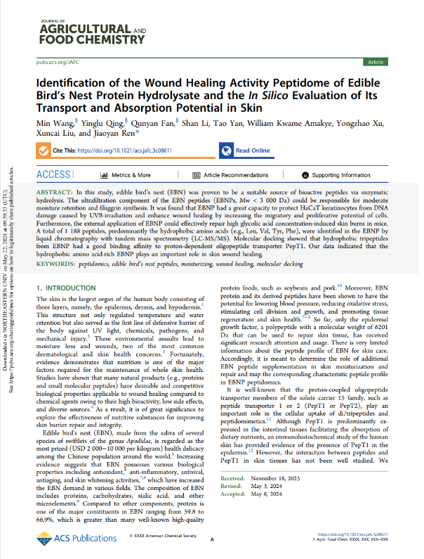 燕之屋多年來致力于燕窩肽的研發(fā),挖掘燕窩肽功效與價值。2022年1月,燕之屋正式成立燕窩肽研究中心,開拓品牌在燕窩肽酶解技術(shù)、活性成分與功能研究、消費品研發(fā)、標(biāo)準(zhǔn)化等方向的新賽道,從制備工藝到活性研究均取得了顯著進展和突破,其研究成果已刊登于多個國際權(quán)威期刊。2021年,燕之屋燕窩研究院和江南大學(xué)食品科學(xué)與技術(shù)國家重點實驗室聯(lián)合完成燕窩肽美白功能研究,成果“A study on the skin whitening activity of digesta from edible bird's nest: A mucin glycoprotein”發(fā)布于權(quán)威學(xué)術(shù)性期刊《Gels》;2022年,燕之屋燕窩研究院攜手香港科技大學(xué)攜手完成燕窩肽抗皮膚炎癥功能研究,成果“Edible bird’s nest, an Asian health food supplement, possesses anti-inflammatory responses in restoring the symptoms of atopic dermatitis: An analysis of signaling cascades”發(fā)布于權(quán)威學(xué)術(shù)性期刊《Frontiers in Pharmacology》;2023年,燕之屋聯(lián)合華南理工大學(xué)開展的燕窩肽皮膚修護功能的研究“Identification of the Wound Healing Activity Peptidome of Edible Bird‘s Nest Protein Hydrolysate and the In Silico Evaluation of Its Transport and Absorption Potential in Skin”被食品科學(xué)領(lǐng)域國際權(quán)威SCI收錄期刊《Journal of Agricultural and Food Chemistry》正式收錄;2024年,燕之屋深入挖掘了燕窩肽的美白作用機制,論文“Edible bird's nest peptide (EBNP) with high whitening activity: Sequences analysis, whitening activity characterization and molecular docking study”發(fā)表于SCI收錄期刊《Journal of Functional Foods》。這些科研成果不僅體現(xiàn)了燕之屋在該領(lǐng)域的長期積累和深入探索,也彰顯了其對科研工作的重視與持續(xù)投入,充分展現(xiàn)了其在食品科學(xué)領(lǐng)域的雄厚實力和高水平研究能力。
