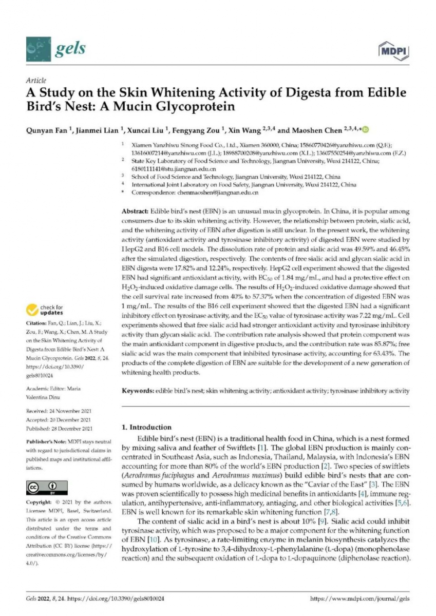 在2021年12月28日,燕之屋燕窩研究院和江南大學(xué)食品科學(xué)與技術(shù)國家重點(diǎn)實(shí)驗(yàn)室攜手完成并刊登了專業(yè)研究成果《食用燕窩消化物的皮膚美白活性研究:一種黏蛋白糖蛋白》,并發(fā)布于權(quán)威學(xué)術(shù)性期刊《gels》。此次研究實(shí)驗(yàn)通過HepG2和B16細(xì)胞模型研究了燕窩消化物(酶解物)的美白活性(抗氧化活性和酪氨酸酶抑制活性)。實(shí)驗(yàn)表明:“消化后的EBN具有顯著的抗氧化活性,對酪氨酸酶活性有顯著的抑制作用;從燕窩消化物(酶解物)中不同成分的貢獻(xiàn)率分析表明,燕窩肽是其中主要的抗氧化成分,貢獻(xiàn)率為85.87%,適合開發(fā)新一代美白保健品。”